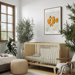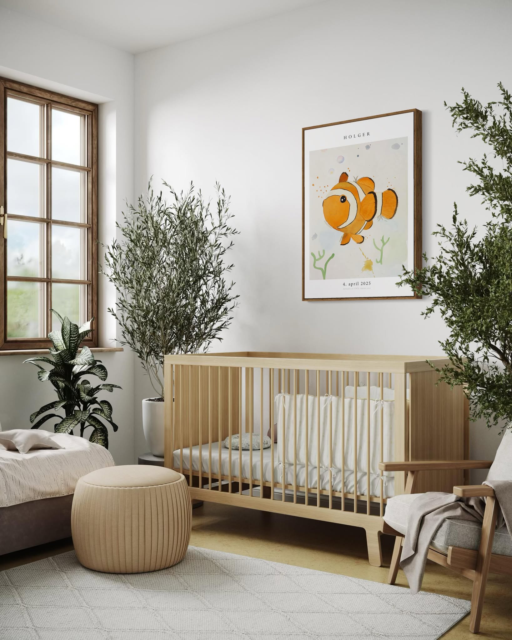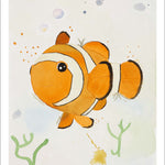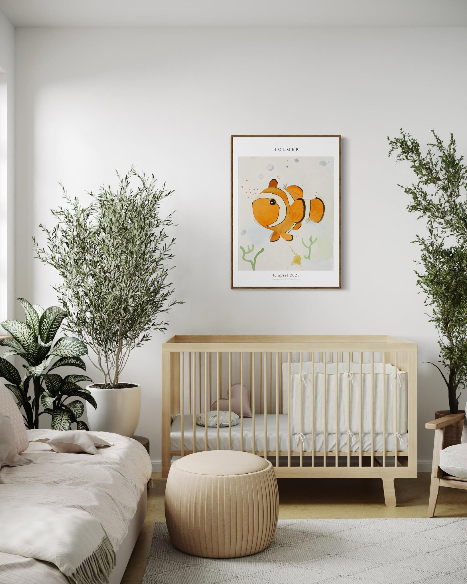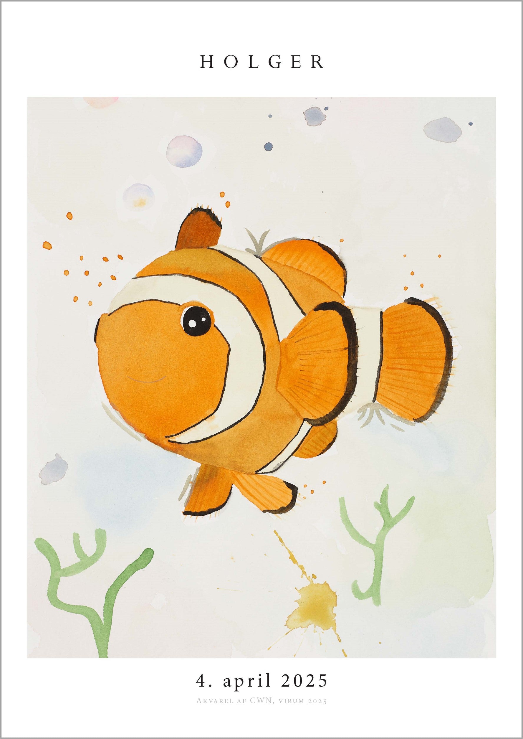 Her er en sød, varm og sjov børne navneplakat med klovnfisk. Den legesyge lille fisk bringer varme og glæde til børneværelset. Børneplakaten hænger sødt sammen med en af mine andre akvarel plakater med dyr. Navneplakaten med fisk kan også sagtens hænge alene.