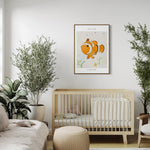 Her er navneplakaten med klovnfisk i rammen Egetræ Natur, som kan tilkøbes.